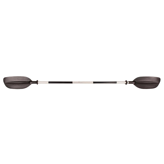 Entry level recreational kayak paddle. Asymmetric blades of polypropylene shaped for smooth, efficient strokes. A lightweight anodized aluminum shaft is ovalized for easy gripping. This is the paddle of choice for beginners - or for use as a backup. A push-button takedown allows blades to be feathered at 60-degrees or inline, for right- and left-hand control.